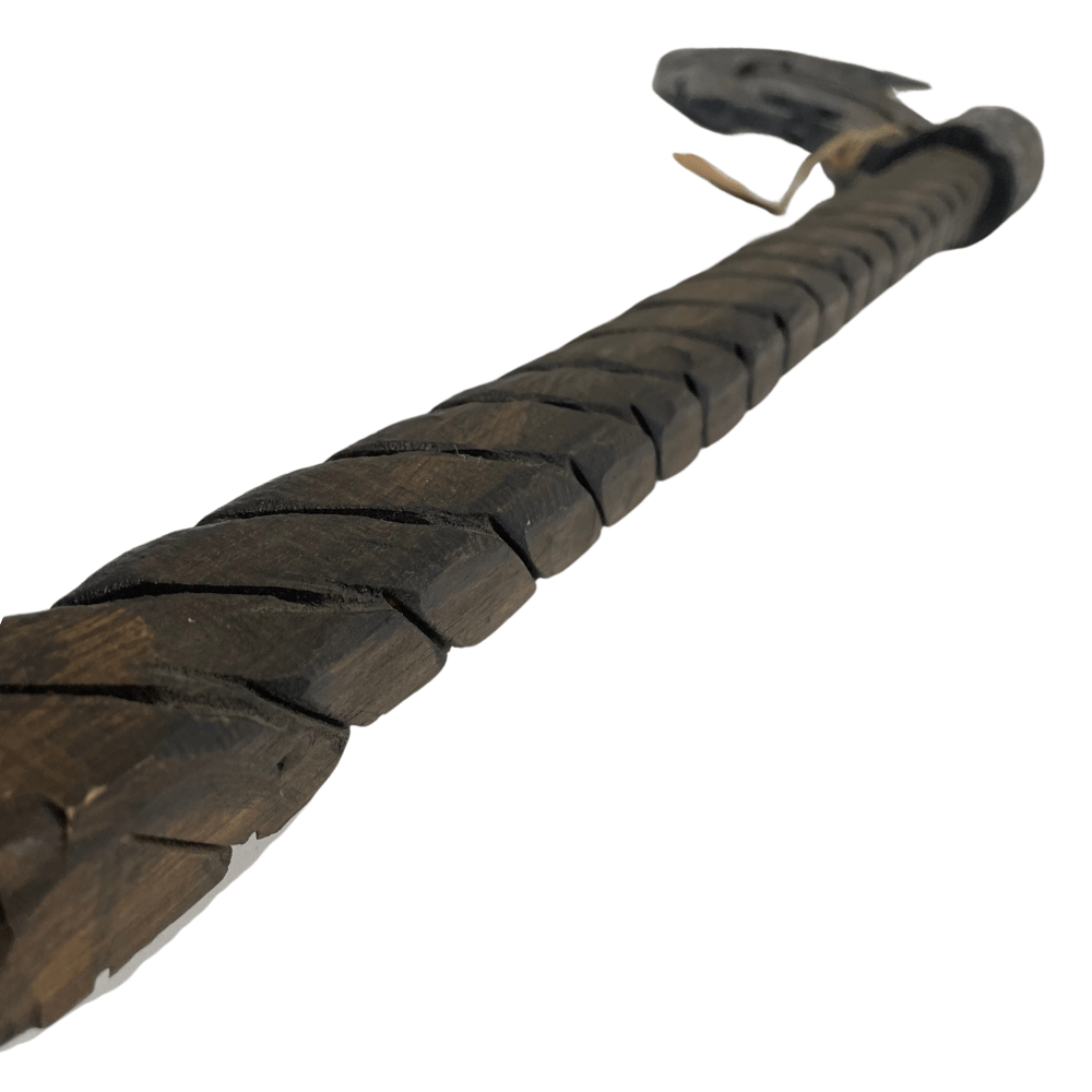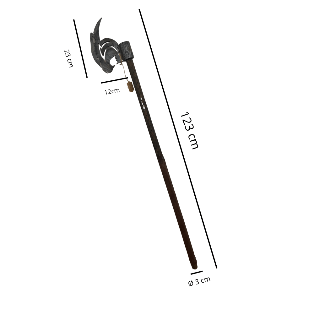 Il manico in legno naturale aggiunge autenticità e solidità alla struttura dell’arma. Rifinito con dettagli scolpiti e tonalità scure, evoca il fascino delle antiche armi da battaglia. Il design ergonomico assicura una presa salda e confortevole, mentre le eventuali decorazioni e incisioni arricchiscono il suo carattere artigianale.
